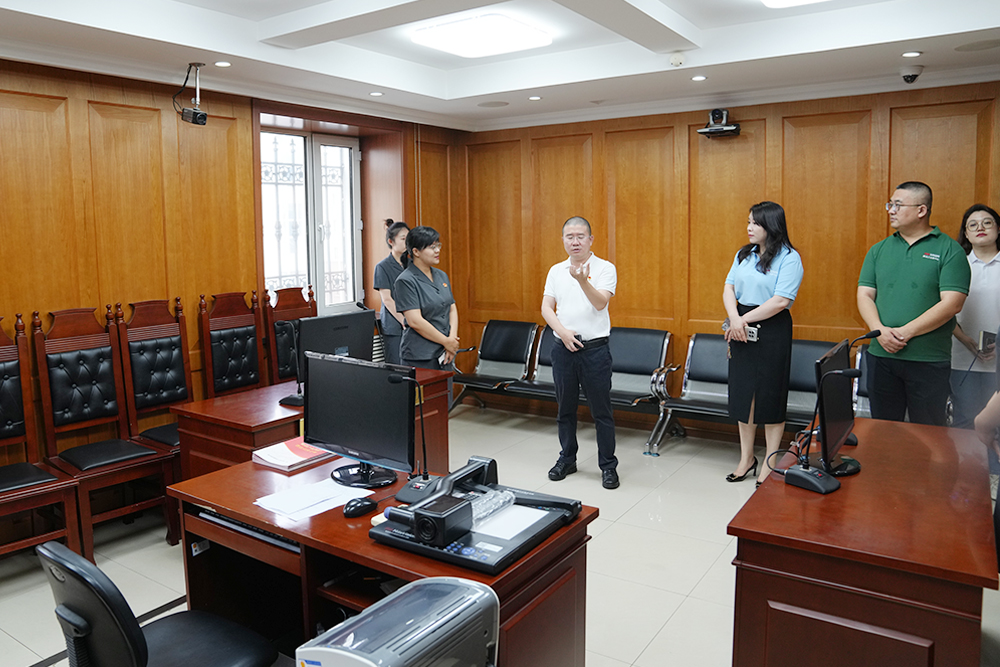 近日,杭州海康威视数字技术股份有限公司哈尔滨分公司负责人王玉波一行走进南岗区法院参加“公众开放日”活动。南岗区法院综合审判庭庭长王炳跃,审判管理办公室(研究室)主任公丕潜,综合审判庭副庭长庄静,执行局员额法官张迪等陪同参观座谈。