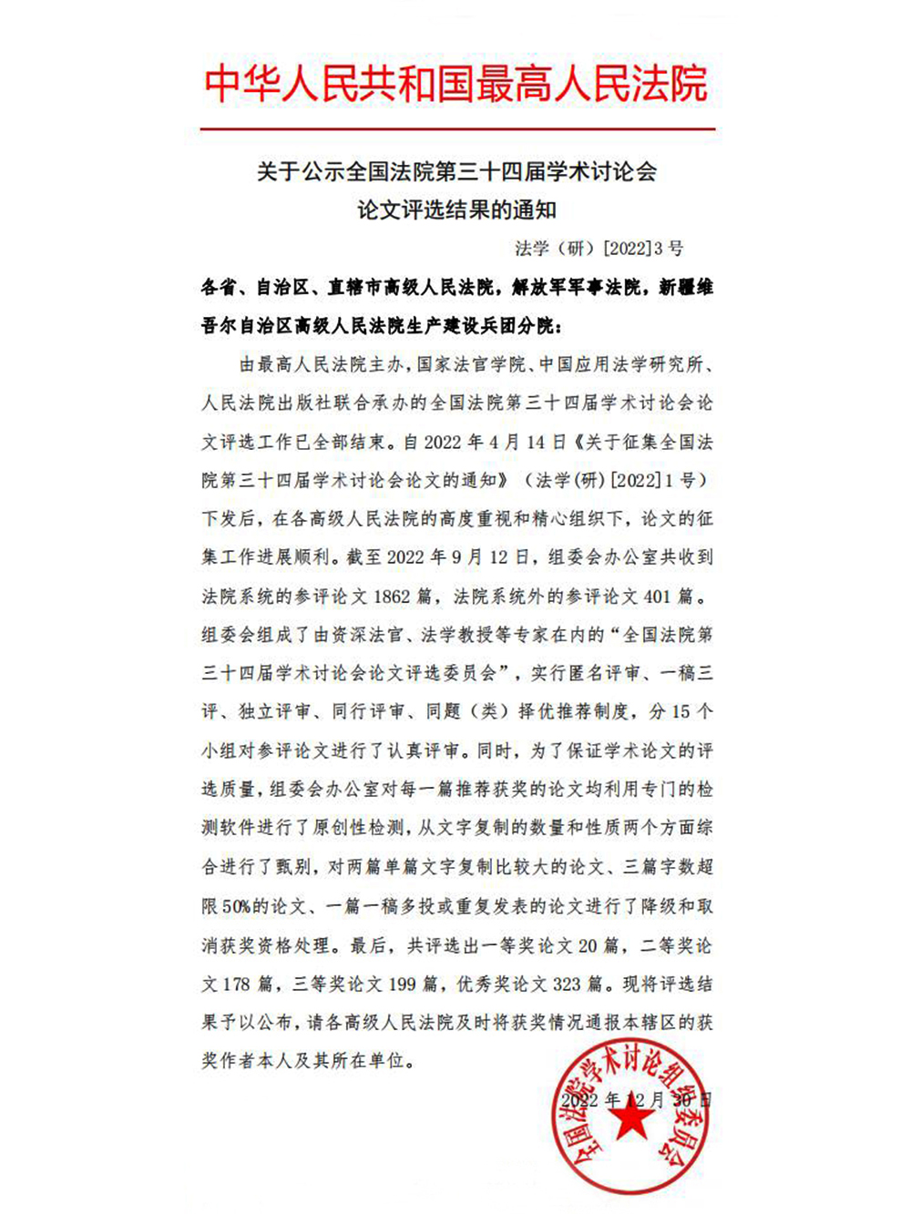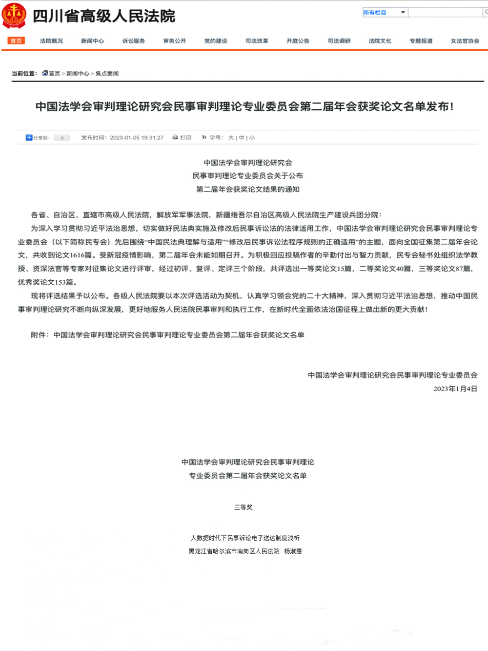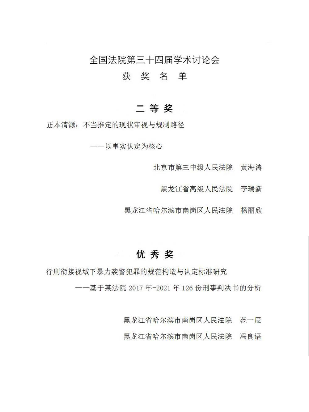 在最高人民法院主办,国家法官学院、中国应用法学研究所、人民法院出版社联合承办的全国法院第三十四届学术讨论会论文评选中,南岗区法院民事审判二庭副庭长杨丽欣撰写的论文《正本清源:不当推定的现状审视与规制路径——以事实认定为核心》荣获二等奖,党组成员、副院长范一辰、法官助理冯良语撰写的论文《行刑衔接视域下暴力袭警犯罪的规范构造与认定标准研究——基于某法院2017年—2021年126份刑事判决书的分析》荣获优秀奖;速裁审判庭干警杨淑惠撰写的论文《大数据时代下民事诉讼电子送达制度浅析》在中国法学会审判理论研究会民事审判理论专业委员会组织的第二届年会论文评比活动中荣获三等奖;另有2篇论文荣获全市优秀法学研究成果奖。