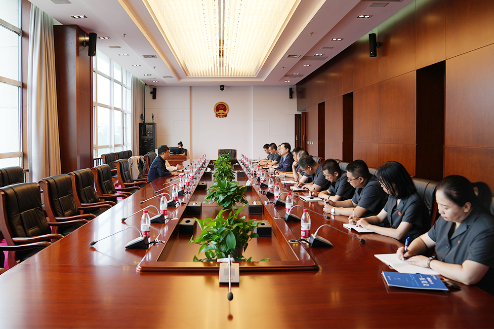 王言斌副主任向常鹤院长一行介绍了金融司法协同中心五化运行模式和诉源治理机制,并分享了金融司法协同中心提升审判工作质效的经验做法。