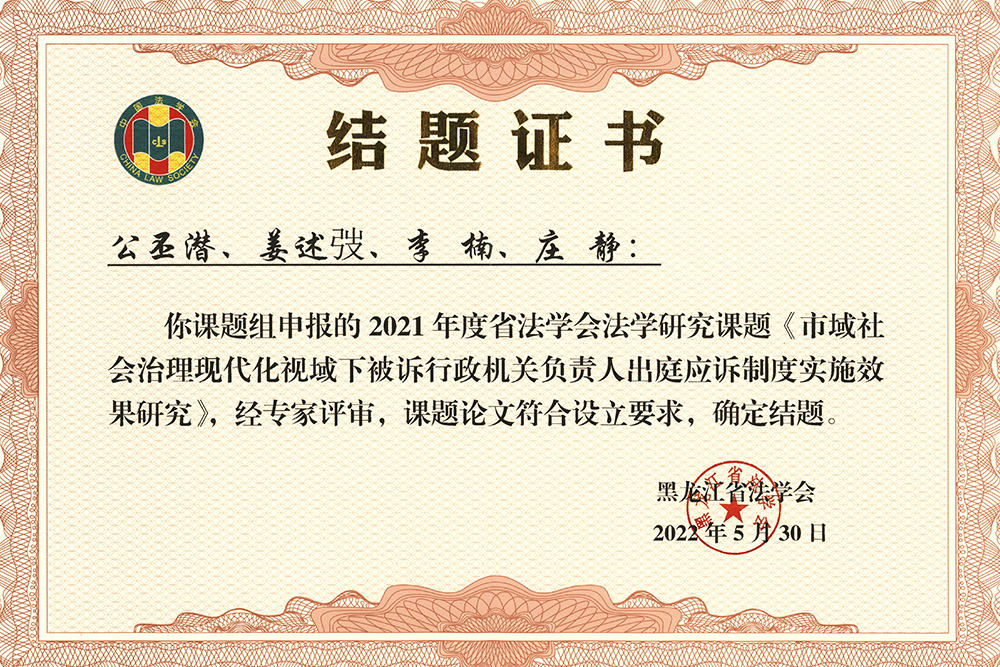 值得一提的是,公丕潜申报的课题已经连续三年入选黑龙江省法学会法学研究立项课题。2021年,公丕潜申报的课题《市域社会治理现代化视域下被诉行政机关负责人出庭应诉制度实施效果研究》被确定为省法学会法学研究年度重点课题并顺利结项。2022年,公丕潜申报的课题《人民法庭参与市域社会治理的组织优势与职能作用研究》被确定为省法学会法学研究年度课题并顺利结项。