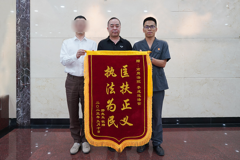 “感谢各位法官不辞辛劳往返一万多里路,到这么远的地方办理我这个案子,你们真的是老百姓的贴心人啊!”近日,申请执行人邢某将一面印有“匡扶正义 执法为民”的锦旗送至南岗区人民法院,感谢常纪刚局长和办案人李成运的辛勤付出。
