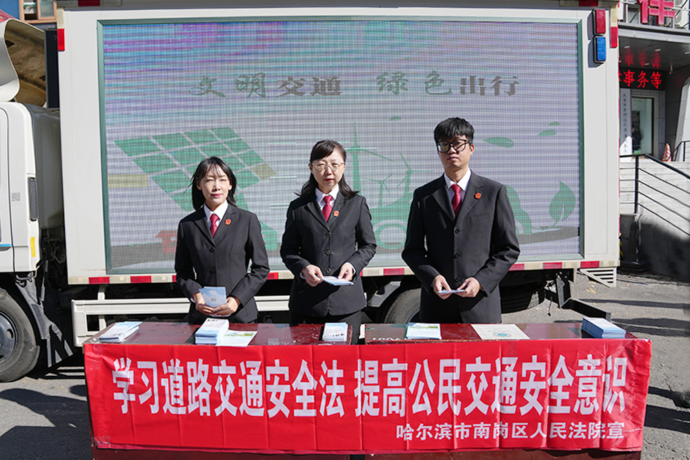活动中,南岗区人民法院民一庭庭长张艳、员额法官孙宇和王嗣钧,在哈尔滨市公安交警支队南岗大队院内,悬挂“学习道路交通安全法,提高公民交通安全意识”普法宣传条幅,面对面与来往司机、驾驶员、准驾驶员等群众讲解交通法规,现场答疑解惑,并发放普法宣传手册,以通俗易懂的语言为来往群众强调闯红灯、疲劳驾驶、分心驾驶、超速驾驶、无证驾驶、酒驾醉驾、非法超载等严重交通违法行为可能造成的严重后果和需要承担的法律责任,同时提醒广大群众在出行时严格遵守交通规则,自觉遵守道路交通安全法律法规,主动提升道路交通安全意识。
