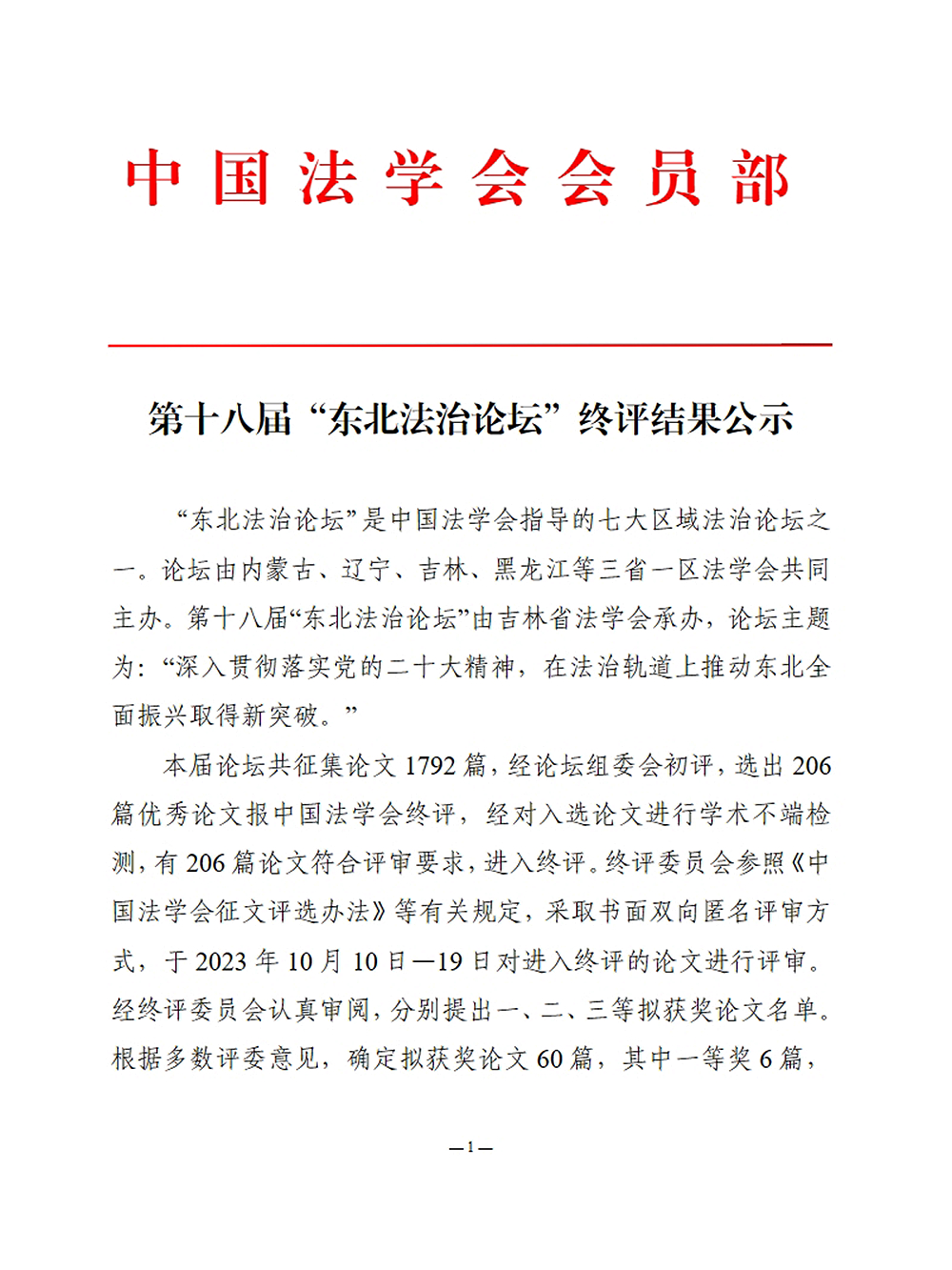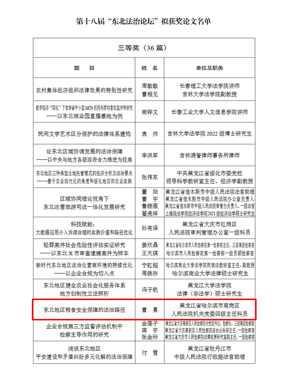 近日,由中国法学会指导,内蒙古、辽宁、吉林、黑龙江三省一区法学会共同主办的第十八届“东北法治论坛”终评结果公示,南岗区人民法院机关党委干警曹熹撰写的论文《东北地区粮食安全保障的法治路径》从1792篇论文中脱颖而出,荣获三等奖。