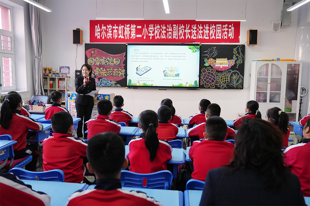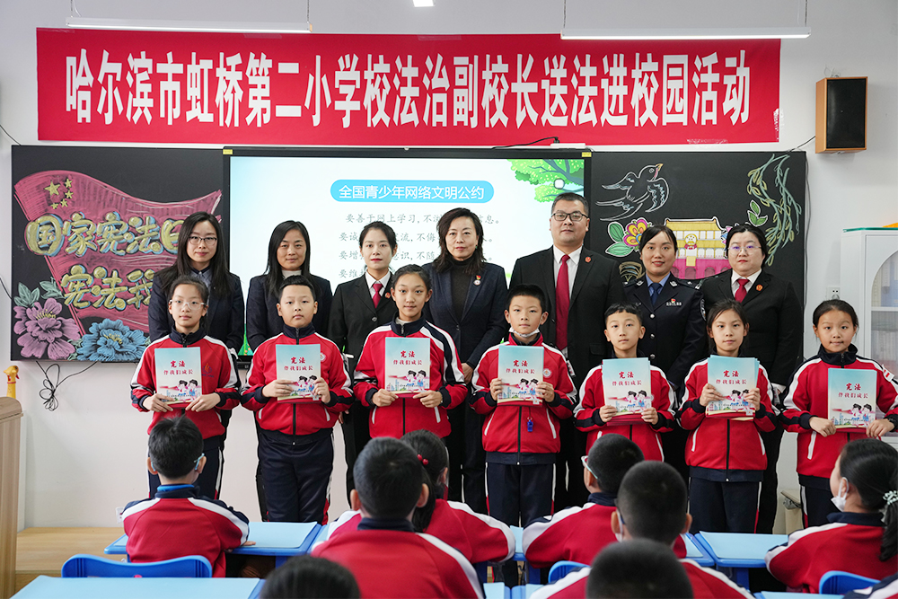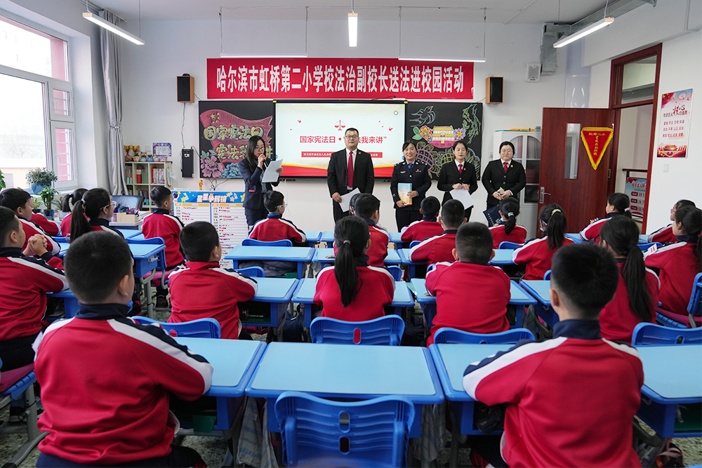 审判管理办公室(研究室)主任公丕潜向哈尔滨市虹桥第二小学校的师生详细讲述了我国寻宪、制宪、修宪、奉宪的演进历程以及我国宪法深远的历史意义,普及了“国家宪法日”的相关知识,引导同学们牢固树立法治信仰、法治意识、法治观念、法治思维。
