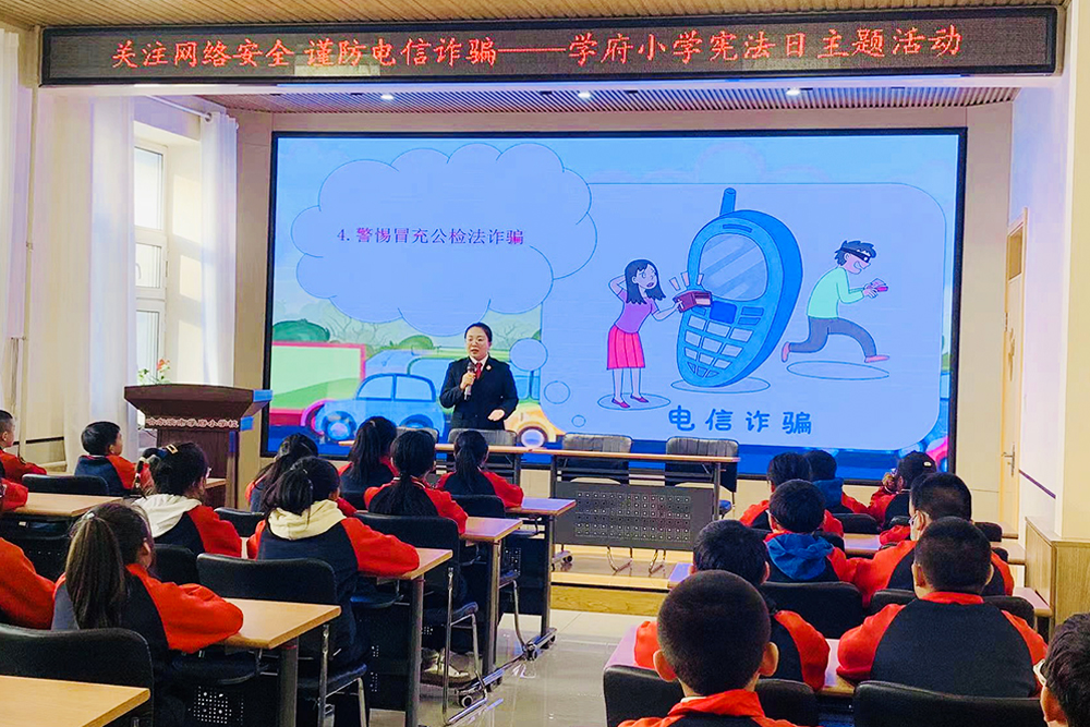 哈西人民法庭员额法官付鑫蕊带领哈尔滨市学府小学校的师生们通过PPT授课、观看小视频的方式了解网络诈骗的概念,宣讲了识别、防范网络诈骗的小技巧,结合鲜活案例“以案开讲”,引导同学增强对“网络诈骗”的免疫力和抵抗力。