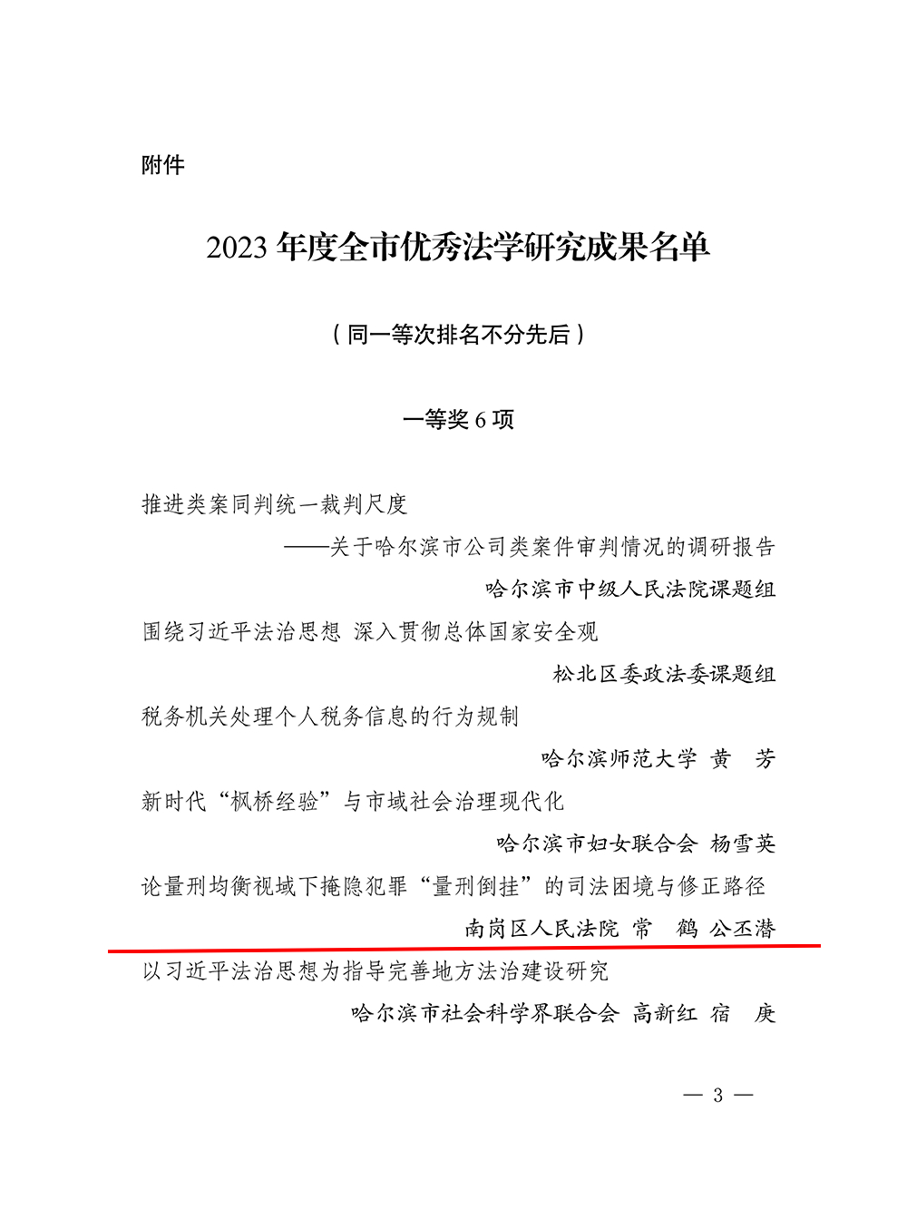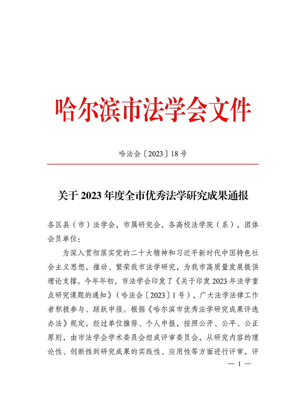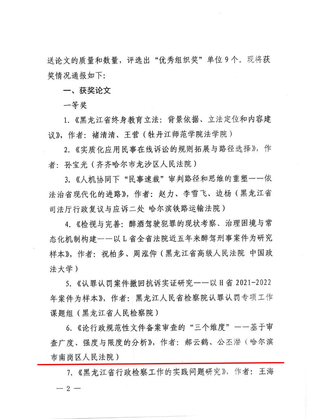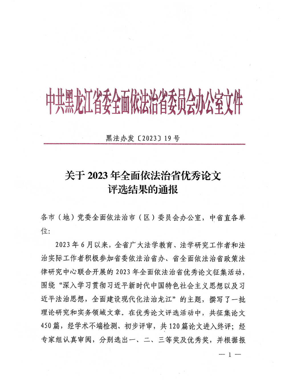 中共黑龙江省委全面依法治省委员会办公室印发《关于2023年全面依法治省优秀论文评选结果的通报》,南岗区人民法院党组成员、副院长郝云鹤,审判管理办公室(研究室)主任公丕潜撰写的论文《论行政规范性文件备案审查的“三个维度”——基于审查广度、强度与限度的分析》荣获2023年全面依法治省论文一等奖。