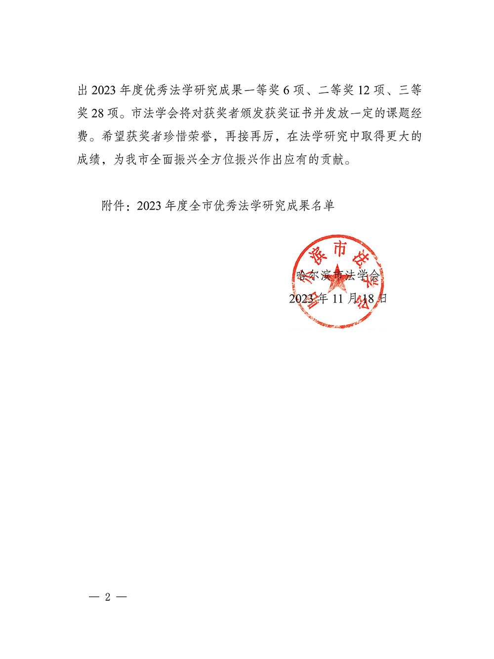 近日,哈尔滨市法学会印发《关于2023年度全市优秀法学研究成果通报》,南岗区人民法院党组书记、院长常鹤,审判管理办公室(研究室)主任公丕潜撰写的论文《论量刑均衡视域下掩隐犯罪“量刑倒挂”的司法困境与修正路径》荣获2023年度全市优秀法学研究成果一等奖。