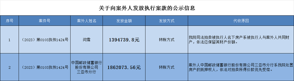 为切实巩固执行案款清理成果,强化执行案款管理,依法维护当事人合法权益,防范廉政风险,确保执行案款发放规范有序、及时高效。依据《黑龙江省高级人民法院向案外人发放执行案款公示制度》的规定,现将向案外人发放执行案款信息予以公示,公示期间2024年2月29日起至2024年3月7日止。