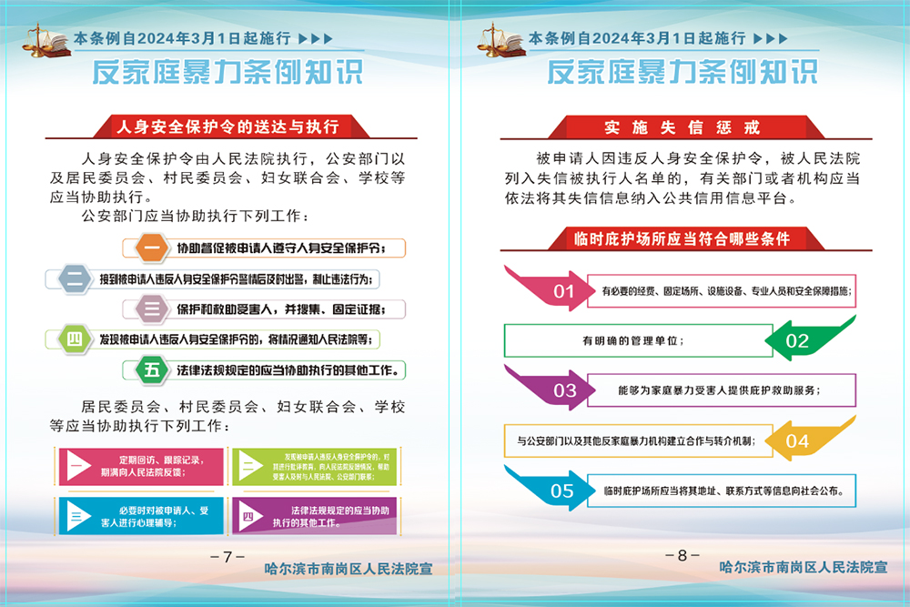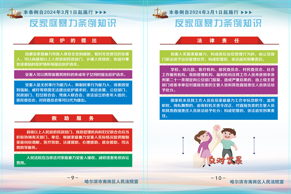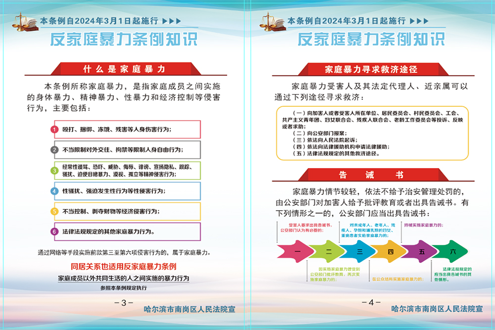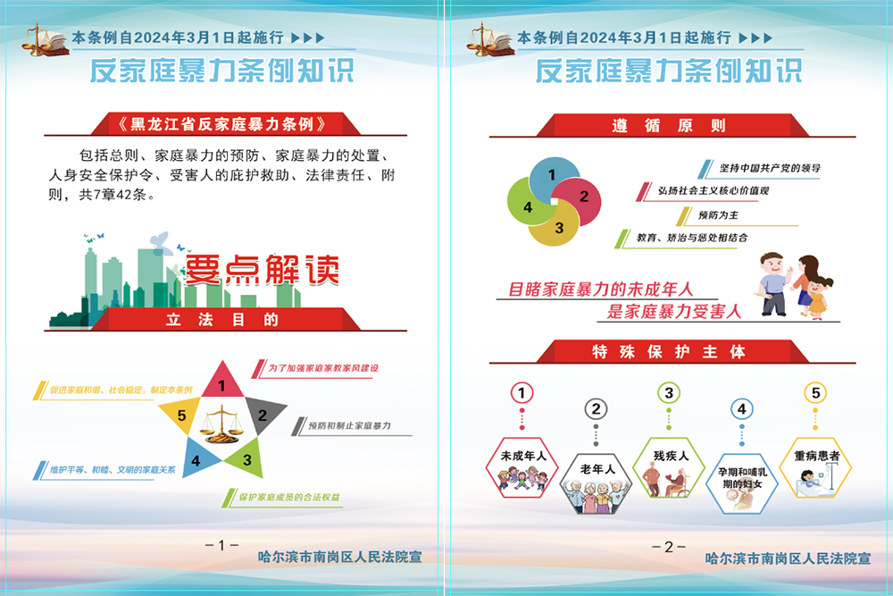 南岗区人民法院家事少年审判庭深刻领会《条例》重要内容,制定《条例》宣传画册,对《条例》进行全文解读。以图文并茂的形式,围绕总则、家庭暴力的预防、家庭暴力的处置、人身安全保护令、受害人的庇护救助、法律责任、附则等7章42条进行宣传,并针对常见问题,详细写明对策,给予受害者有效的指引。
