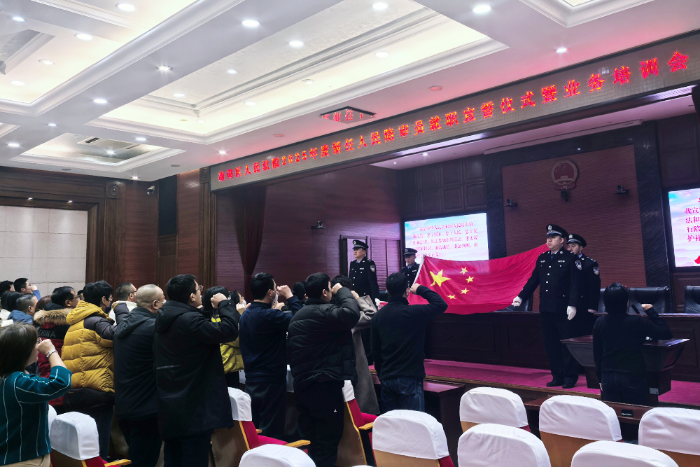 活动在庄严的国歌声中拉开帷幕。在鲜艳的五星红旗前,103名新任命的人民陪审员神情肃穆,右手举拳,跟随领誓人郑重宣誓:“我是中华人民共和国人民陪审员,我宣誓:忠于国家,忠于人民,忠于宪法和法律,依法参加审判活动,忠实履行陪审职责……”铿锵誓言,回荡全场,展现了新任人民陪审员尊崇宪法、忠诚履职、维护公平正义的坚定决心。