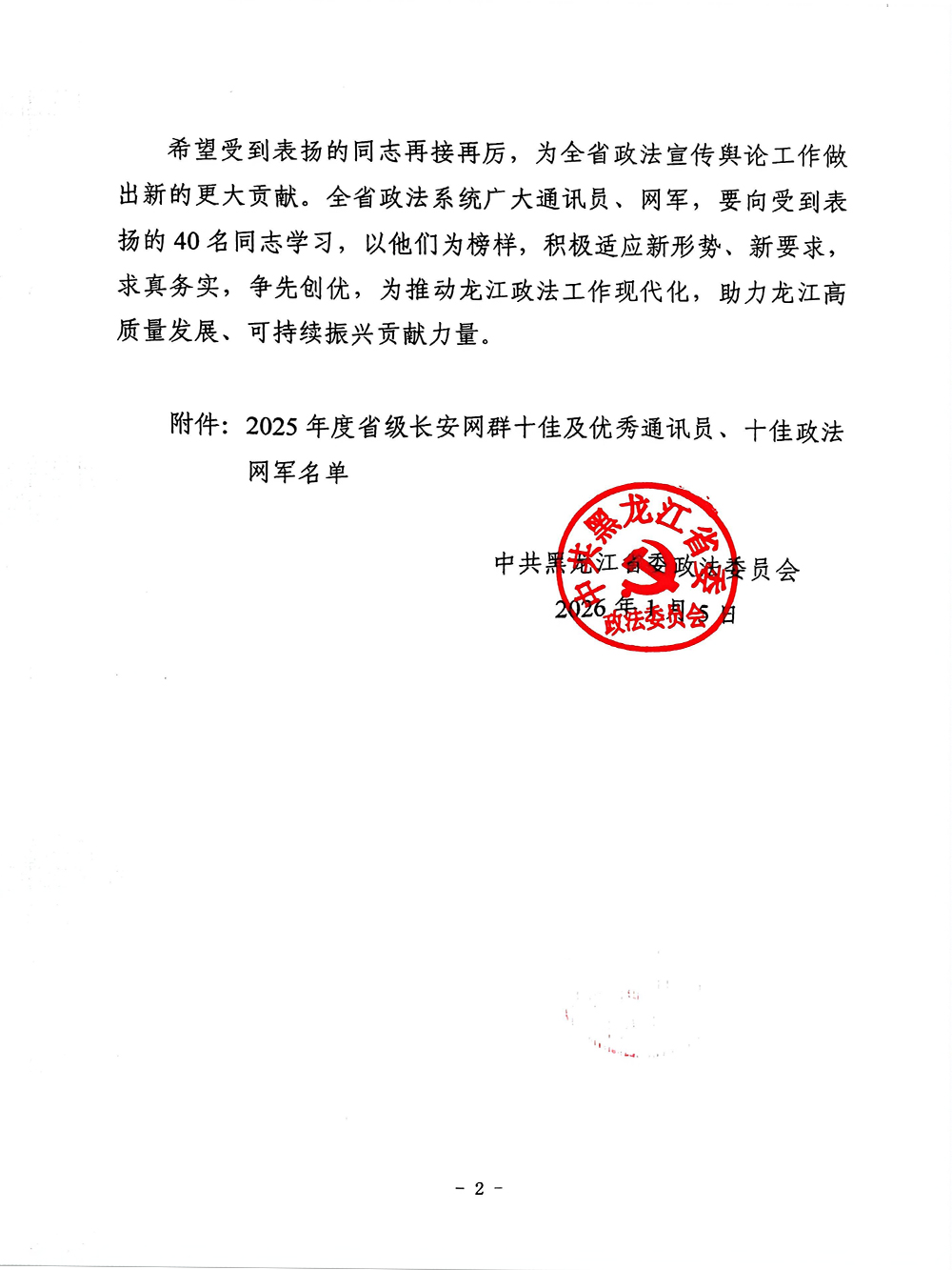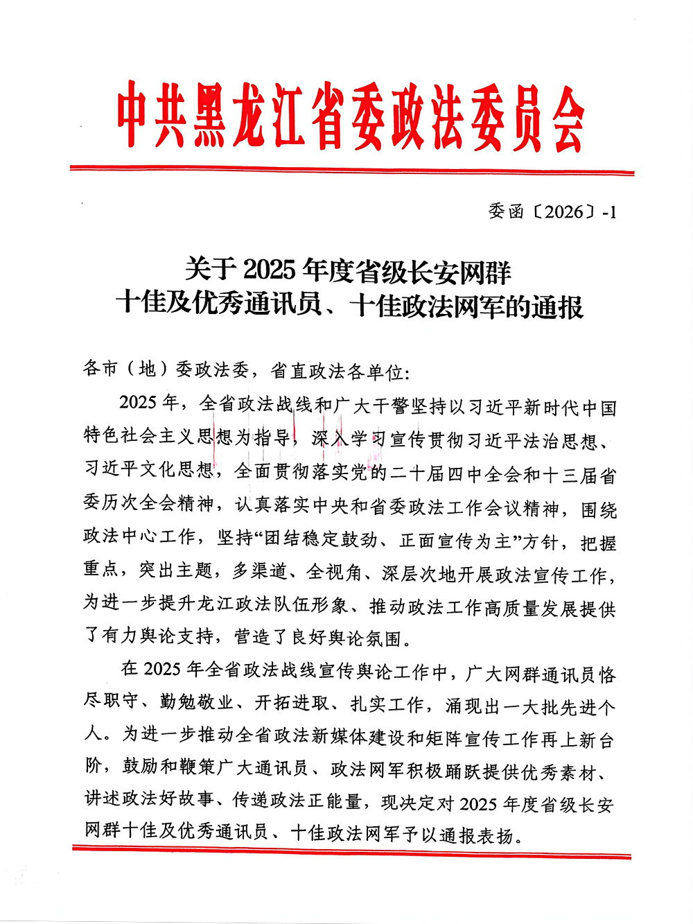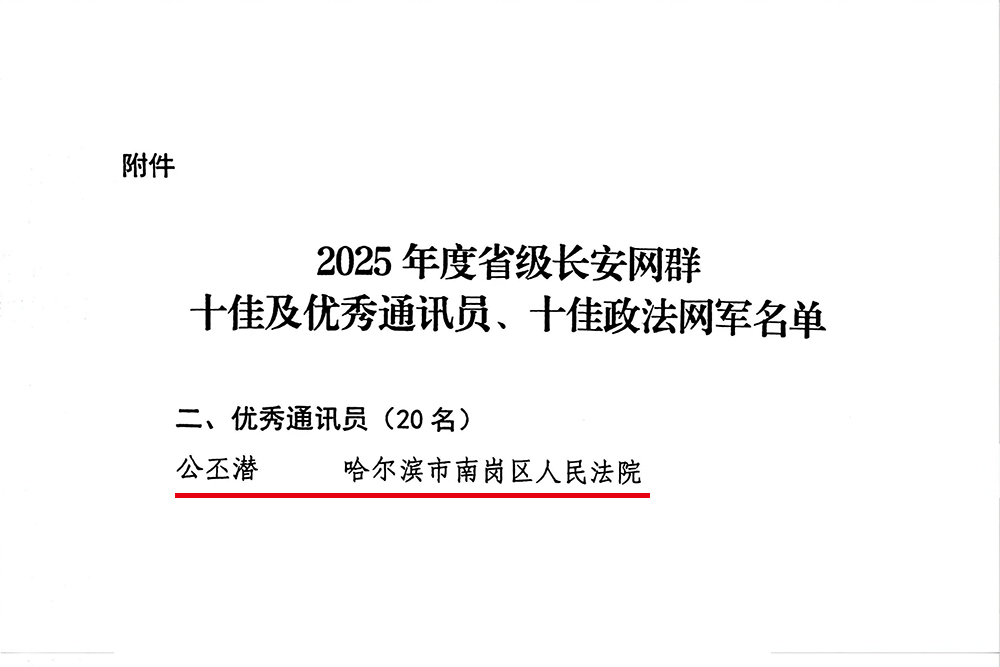 近日,中共黑龙江省委政法委员会印发《关于2025年度省级长安网群十佳及优秀通讯员、十佳政法网军的通报》。其中,南岗区人民法院公丕潜获评“2025年度省级长安网群优秀通讯员”。