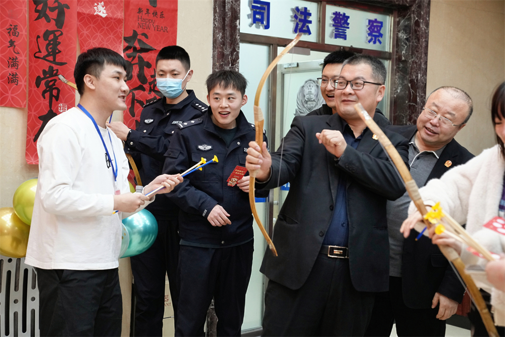 趣味游戏区,加油声、喝彩声不绝于耳,干警们积极参与“好运乒乓”“欢喜套圈”“快乐蹴鞠”“金马射箭”等游戏,干警们大展身手,气氛热烈、笑声满堂。