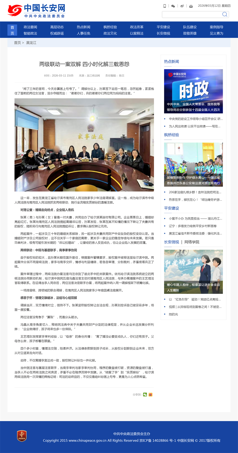 中国长安网宣传报道:两级联动一案双解 四小时化解三载恩怨