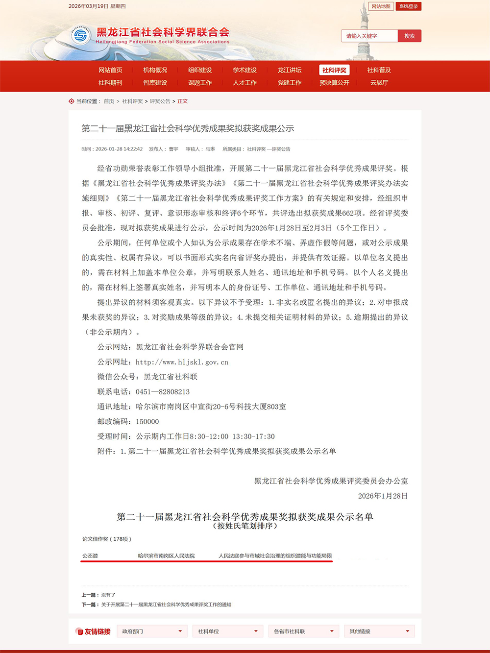 近日,第二十一届黑龙江省社会科学优秀成果奖评审结果揭晓。我院一项成果获论文佳作奖。