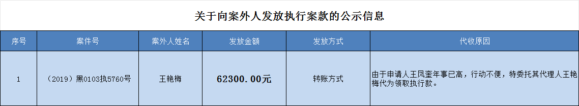 为切实巩固执行案款清理成果,强化执行案款管理,依法维护当事人合法权益,防范廉政风险,确保执行案款发放规范有序、及时高效。依据《黑龙江省高级人民法院向案外人发放执行案款公示制度》的规定,现将向案外人发放执行案款信息予以公示,公示期间:2026年4月13日起至2026年4月20日止。 在公示期限内,案件当事人或其他利害关系人主张权利的,应提交书面意见并附证据材料,由本院审查处理。公示期满且无异议的,本院将按照执行案款管理规定办理发放手续。