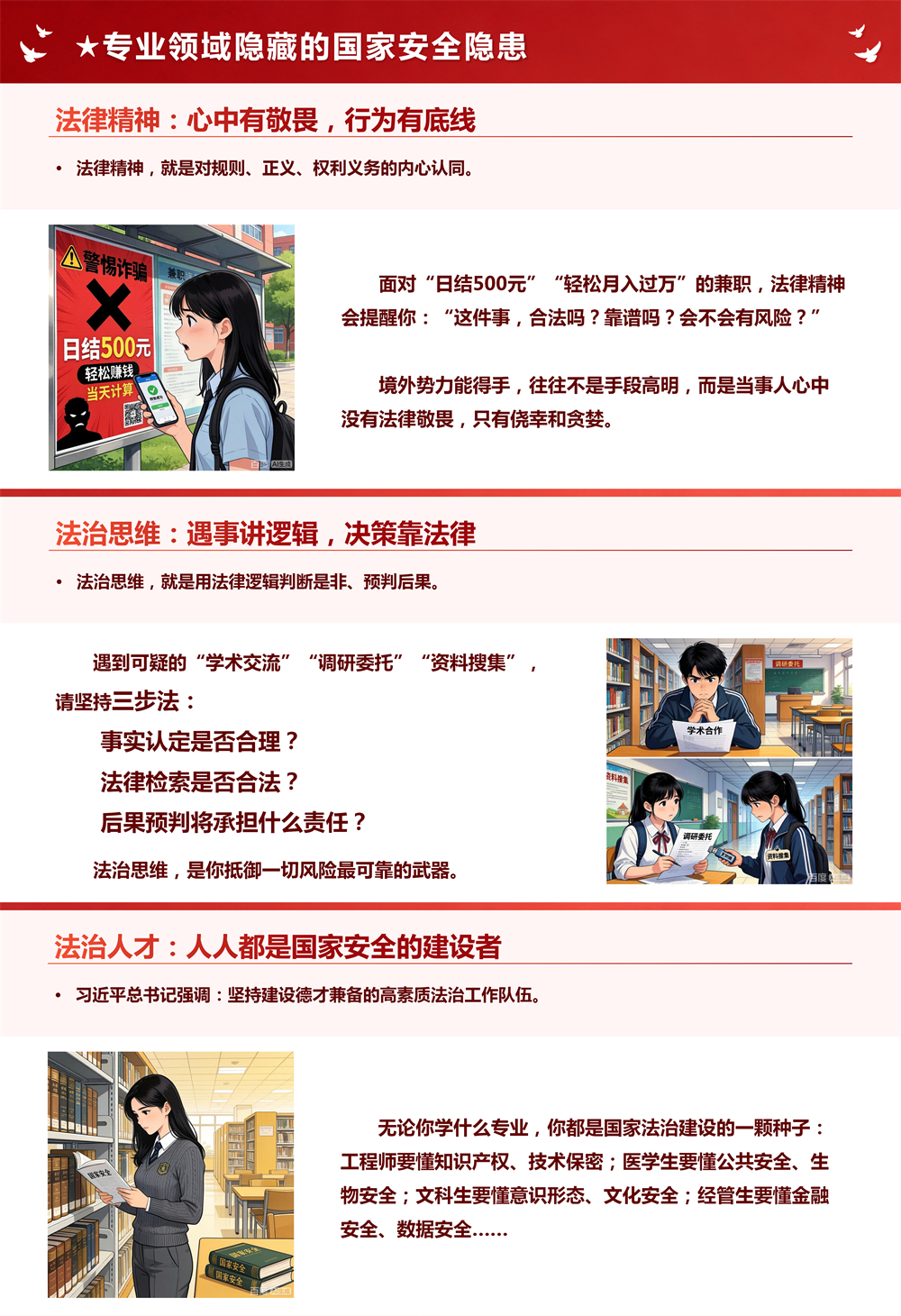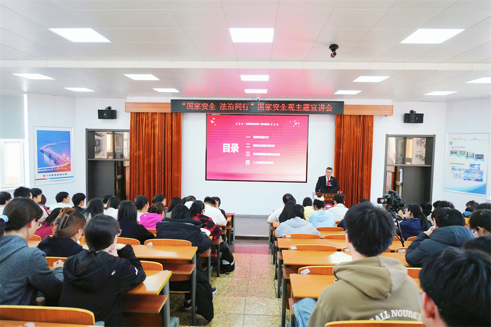 公丕潜主任立足法院审判实践,系统梳理了大学生群体容易忽视的法律风险点,逐一剖析建筑学、农学、经济学、信息管理等不同专业背后可能隐藏的国家安全隐患,引导青年学子将国家安全意识内化为专业素养的重要组成部分。整场讲座摒弃空泛说教,以法官的真诚告诫和法律人的理性思辨贯穿始终。“境外势力之所以能够得手,往往并非其手段多么高明,而是当事人心中缺乏对法律的敬畏,只剩下侥幸与贪婪。”一句句掷地有声的话语,直抵学生内心,引发深刻反思。