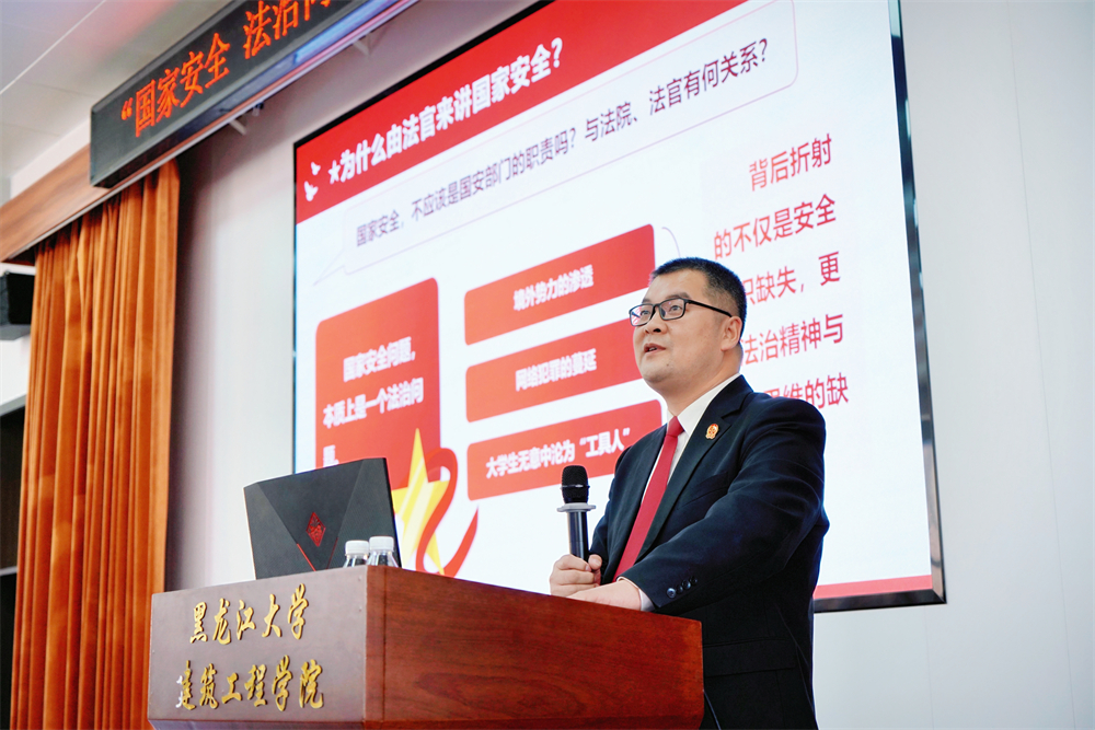 为深入学习贯彻习近平法治思想,全面贯彻落实总体国家安全观,切实履行“谁执法谁普法”普法责任制。近日,南岗区法院审判管理办公室(研究室)主任公丕潜应邀走进黑龙江大学,以“筑牢国家安全防线 青春挺膺担当”为主题,为该校师生带来一堂生动深刻的国家安全法治教育专题讲座。此次活动以法治力量护航青春成长,将国家安全意识的种子播撒在青年学子心间。